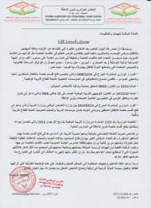 القرار الوزاري المشترك المؤرخ في 1998/12/20 الذي يتضمن فتح أقسام خاصة بالأطفال المتأخرين ذهنينا وضعيفي الحواس ناقصي السمع و المكفوفين في المؤسسات التعليمية التابعة لقطاع التربية الوطنية ، كما توجد قوانين اخري تخص هاته الشريحة اخرها التعليمة الوزارية رقم 1122من القانون التوجيهي للتربية الوطنية بتاريخ 27 جوان 2016 والتي تتضمن أجراء ا استثنائيا بفتح أقسام خاصة بذوي الإعاقة في المدارس العادية