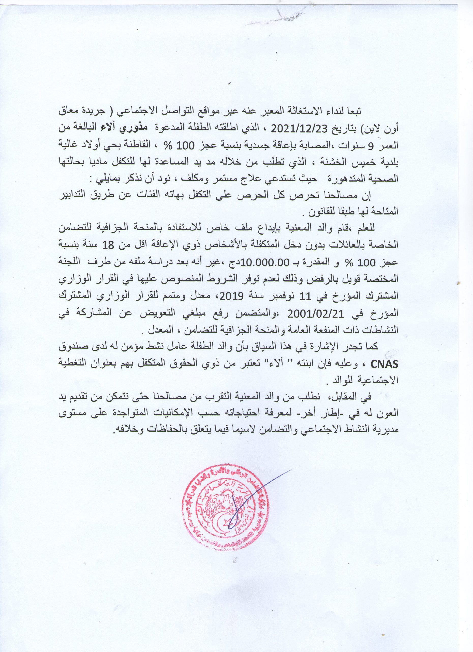 “.فتاة انا بعمر التاسعة عرفت الألم منذ نبوغي ومحيته ببذرة الألم التي زرعتها انا بنفسي وزرعتها أمي بي ووالدي نشرها بقلبي ، لكن لن أستطيع الوقوف لوحدي ،ابي لن يستطيع تغطية نفقاتي وليس لأمي ماتقدمه لأجلي اكثر من دعمي ، انا فتاة أحتاج لجبائر كي تستقيم قدماي ، جبائر الليل التي أراد ابي تقديمها لي لكن لم يستطيع لأنها اكثر من قدرتاه فهي تقدر ب “120000دج ” ، أحتاج لجبائر النهار التي تمكنني من السير ولا تحسسني بالعجز هذه التي ارادت أمي إن تصنعها لي لكن اغلى من قدرات يديها فسعرها يتراوح من ” 140000دج” الى “160000دج ” .
