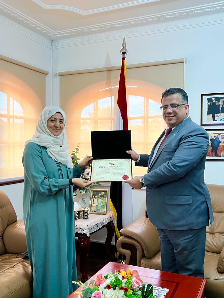 وفي التكريم بشهادة الشكر والتقدير باسم سفارة الجمهورية اليمنية في العاصمة الماليزية كوالالمبور للاعبة “منال الأشول” .