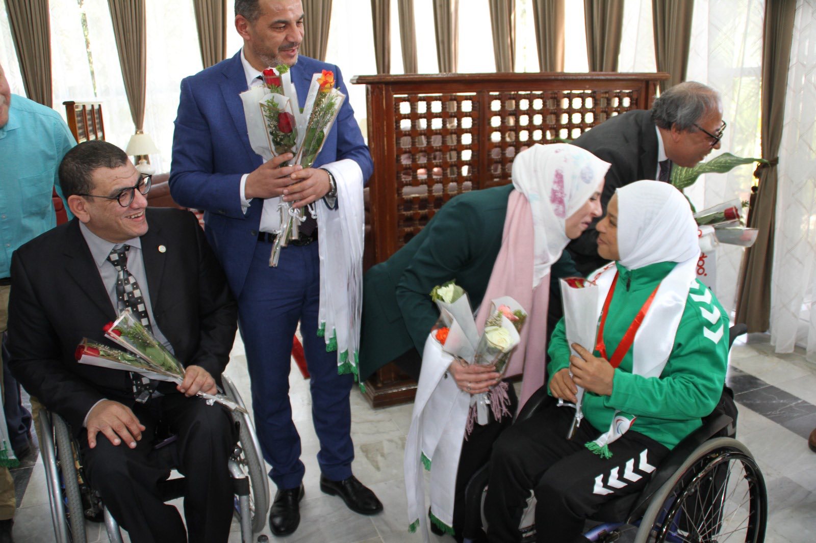وجرى هذا الاستقبال بحضور الأمين العام لوزارة الرياضة، السيد فؤاد مخلوف، مرفوقًا بعدد من الإطارات والمسؤولين، من بينهم السادة بوشاقور عيسى، عتبي محمد، بنطالب هادية، ودبيان مولود، إلى جانب رئيس الاتحادية الجزائرية لرياضة ذوي الاحتياجات الخاصة السيد العسري سيد أحمد، وأعضاء المكتب الفدرالي، فضلاً عن الطاقم الفني والإداري، وكذا حضور لافت لممثلي الأسرة الإعلامية بمختلف وسائلها.